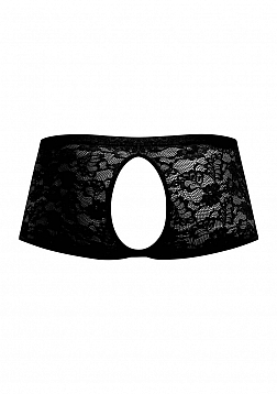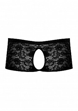Lace short features crotchless front, peek-a-boo cutout back and tone on tone plush elastic trim. Machine wash separately, cold water, gentle cycle. Do not bleach. Tumble dry low heat.