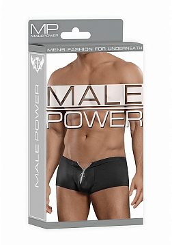 Stretch mini short features comfort fit pouch, functional zipper in front with decorative oval slider and plush elastic waistband and trim. Machine wash separately, cold water, gentle cycle. Do not bleach. Tumble dry low heat.