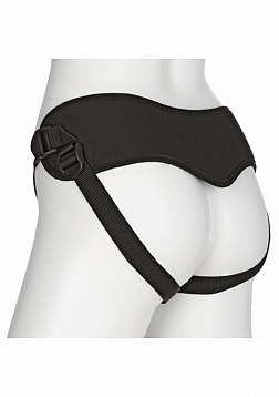 The Supreme Harness is built for comfort and rigorous play. It provides sexy support and is easily adjustable up to 60 inches, with pull-to-tighten straps, open crotch and rear, and a snap front for swapping out attachments. Made of smooth Black neoprene, the Supreme harness works with all Vac-U-Lock attachments as well as strap-on compatible toys. Includes two O-rings. Designed for use by women and men.