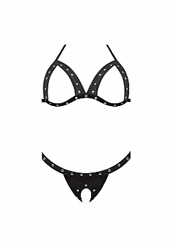 From the Lust collection this style includes: Open Cup bra and crotchless g-string featuring a distinctive leather look fabric with four way stretch, nickel plated studs, adjustable halter straps and a interlocking back strap. (Accessories not included.) soft and stretchy spandex blend offers the ultimate in comfort. Wet look is achieved thru a heat fusion process.