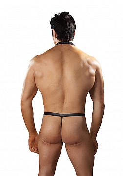 Tormentor features one piece choker g-string with contour peek-a-boo panel pouch, ringed cire waistband with center attached t-strap choker with velcro closure, decorative studs and g-string back.