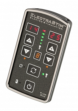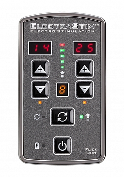 The ElectraStim Flick EM80-M pack includes a Flick Duo dual-channel stimulator, all required cables, a set of 4 ElectraPads, 2 ElectraLoops adjustable cock rings and a Silicone Noir Aura electrode (suitable for vaginal and anal use).