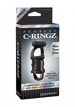 When you're looking for the ultimate vibrating support ring for your cock and balls, the Vibrating Cock Pipe with Ball-Stretcher is the perfect choice to give you that extra edge! Push your package out to its maximum potential and enjoy a super tight tug on your balls while you stay harder and thicker than ever before. You'll love the fat, throbbing erections, and your partner will love the powerful vibrations running through your shaft. The ball stretcher pulls down on your testicles and prevents them from retracting upward, delaying ejaculation and prolonging the fun. The T-style divider puts extra pressure on your sack and separates your balls, giving you the ultimate squeeze for huge hard-ons. Made from our body-safe, super-stretchy TPR, this extreme harness was designed for maximum performance and rock hard erections! Climaxes will never be the same again with this ring! You'll enjoy bulging balls, throbbing erections, increased stamina, and explosive ejaculations. In addition you'll love the incredible vibrations that tease and please. Pull your balls through the ball stretcher first, then stretch the top ring and slide it all the way to the base of your shaft. The unbelievable stretch, form-fitting comfort, and unparalleled lift make this the ultimate ring for harder and longer lasting erections! Cock Ring Diameter: 1.4" (3.5 cm) Ball Stretcher Diameter: 1" (2.5 cm)