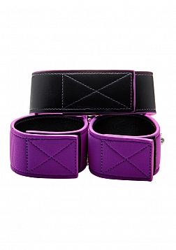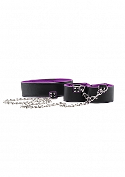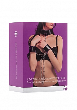 This collar with cuffs is designed with a PU leather and a neoprene side, this allows you to choose the material you will feel on your skin by simply turning the collar or cuffs around. The Neoprene side is colored and the PU leather side is black for a rougher look! Also it features a Velcro lock what means it will fit almost everyone, a snap-closure system to assure it's interchangeable with other bondage toys!