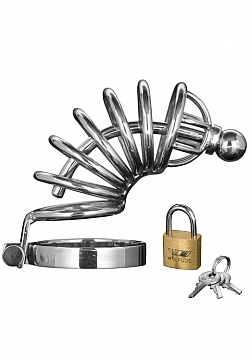 | EAN CODE: |  | 848518005700 |  They will be compliant and under your control while wearing this devious chastity cage. Stainless steel and featuring a curved spine with enclosure rings and a removable cum-thru plug. Simply place him in the cage and fasten the base ring behind the testicles, then lock him up with the enclosed lock and key set. You decide when he is free...Set includes: 1 six ring cock cage, 1 base ring, 1 removable plug, 1 comfort hinge tube, 1 lock, 3 keys. The stainless steel material is non-porous, hygienic, easy to sterilize, temperature resistant, impact resistant, and offers long-term value.