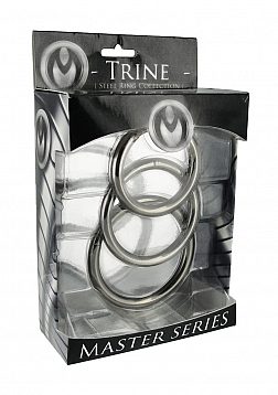 Simple in form, yet intended to be worn with purpose. These steel cock rings are as elegant as they are strict. There is no give here! Simply slip a Trine over the penis like a halo, encircling the scrotum for a supremely snug fit. Revel in the pleasure! The Trine Steel Rings can also be used to fit most harness systems. Measurements: Ring inner diameters: Small: 1.53 inches, Medium: 1.82 inches, Large: 2.05 inches, All rings are 0.3 inches thick