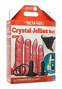 A burst of color makes your play time pop with the Vac-U-Lock Crystal Jellies Set. This deluxe strap-on kit gets your play going in a snap with a complete harness including removable o-rings and the patented Vac-U Plug, four distinct and exciting Crystal Jellies Vac-U-Lock attachments in translucent pink, and a bottle of Mood water-based lube.