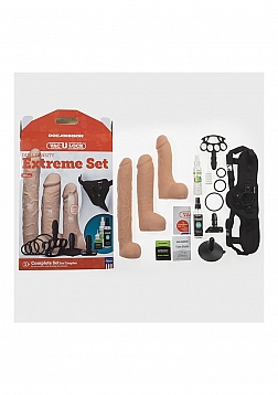 Your perfect strap-on experience is on lock with Doc Johnson’s deluxe line of full-service Vac-U-Lock Harness Sets. Recommended for very experienced players only, the Vac-U-Lock Dual Density Extreme Set offers deeper penetration and more intense feelings of fullness than any other complete Vac-U-Lock set with three extra-large attachments in dual density ULTRASKYN, complete harness with removable o-rings and plug, and a bottle of Mood water-based lube. Measuring 10.5 inches, 12 inches, and an incredible 15.5 inches, these dual density attachments warm to body temperature with use and feature a soft, pliable exterior that gives way to a firm inner core, recreating the feel of a real erect penis. Attachments can be used with the harness, the included Vac-U-Lock suction cup and Knuckle-Up accessories, and any other accessory or harness in the line. The Vac-U-Lock Dual Density Extreme Set also includes Doc Johnson Natural Toy Cleaner and ULTRASKYN Refresh Powder to properly and hygienically maintain your dual density ULTRASKYN attachments. Every product in the patented Vac-U-Lock system is designed to help you create any strap-on or toy you’re in the mood for, and it’s as simple as popping on the attachment of your choice.