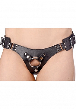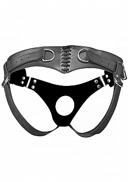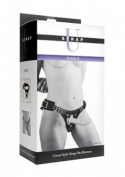 This enticing corset back dildo harness will look absolutely stunning on almost any body type! With adjustable buckles at the hips, sliding D-ring buckles at the buttocks, and a lace up corset style closure at the back, you can find your ideal fit. The corset back arches and curves around your body, creating an irresistible heart shape. The material is vegan-friendly and incredibly comfortable, with a realistic leather-like look. The front has an open hole with three snap straps that support the metal O-ring.