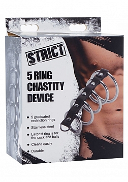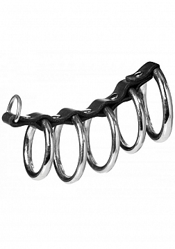 Explore your chastity fantasies with a unique device for your pleasure and amusement! Squeeze the cock and balls of your submissive into the base ring and slide the rest of his penis through the other four rings. If he gets an erection, the rings will be tight against it, constricting him painfully for your enjoyment. The small D-ring on the end allows you to attach weights or other BDSM accessories to tease and torment your pet.
