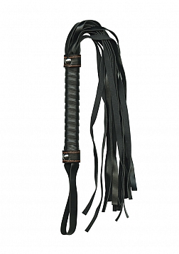 Wonderfully-sized flogger with leather-like strands and strong, sturdy handle. Sexy orange-stitched accents add a touch of fashion and intrigue.