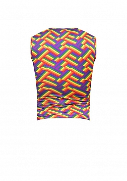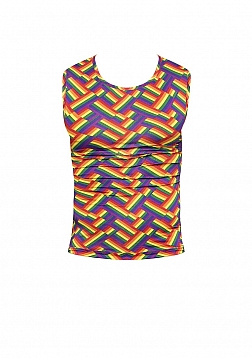 From the Pride Fest collection by Male Power, this style includes: A sleeveless full-back fitness tank featuring a self-binding trim at the shoulders and neckline. Multicolored festive rainbow print in a herringbone pattern. Stretchy and breathable, lightweight poly spandex.