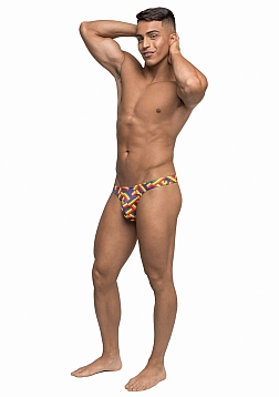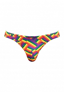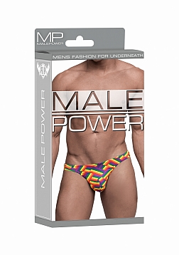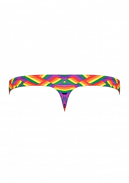 From the Pride Fest collection by Male Power, this style includes: A bong thong with a low rise waist featuring our contoured comfort pouch, one-inch sides, and a T-back. Multicolored festive rainbow print in a herringbone pattern. Stretchy and breathable, lightweight poly spandex.