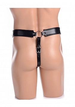 Lock your man up in a comfortable cage that denies him access to his package! This leather-like jock strap locks in the front and back to secure the straps tightly, ensuring that he has no hope for escape. Both the waist strap and the rear strap are adjustable for a custom fit. This sexy chastity belt keeps him confined and at your mercy so that he is reminded that his body belongs to you!