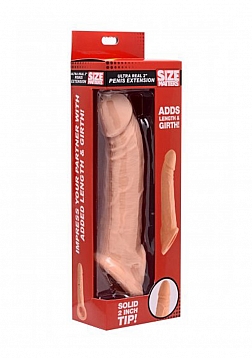 Sculpted with incredible lifelike details, this penis extension gives you more to work with when playing with a partner! Fulfill exciting fantasies when you slip your shaft into the sheath and your scrotum into the strap. Once this extension sleeve is secured, you will have more length and girth to play with. The solid tip alone adds 2 additional inches! This material is soft and realistic, as well as compatible with both silicone and water-based lubricants. Clean with mild soap and warm water.