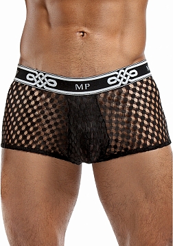 Mini pouch short with lined pouch, waist, high cut legs, new plush MP logo'd waistband.Feather light with soft stretch, open weaving offers a peek a boo effect and features a new MP logo'd plush elastic waistband.