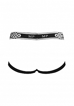 Ring jock with plush elastic leg bands attached to decorative metal rings, new plush MP logo'd waistband. Feather light with soft stretch, open weaving offers a peek a boo effect and features a new MP logo'd plush elastic waistband.