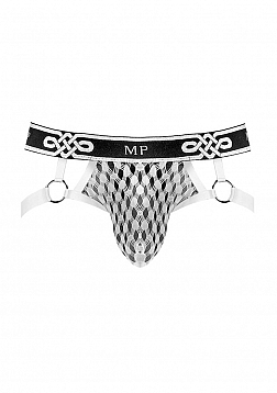 Ring jock with plush elastic leg bands attached to decorative metal rings, new plush MP logo'd waistband. Feather light with soft stretch, open weaving offers a peek a boo effect and features a new MP logo'd plush elastic waistband.