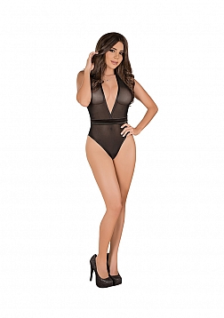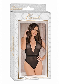 From the Exposed by Magic Silk collection, this style includes: A teddy featuring a deep plunging V neckline with halter style hook and eye closure around the neck, attached satin belt accent with functional hook and eye closure in the back, and a snap crotch.Soft, stretchy mesh paired with sensual stretch satin.
