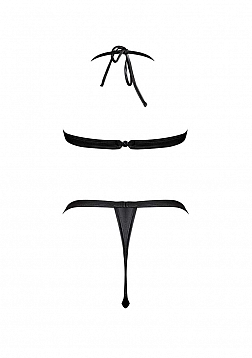 From the Lust collection this style includes: Open Cup bra and crotchless g-string featuring a distinctive leather look fabric with four way stretch, nickel plated studs, adjustable halter straps and a interlocking back strap. (Accessories not included.) soft and stretchy spandex blend offers the ultimate in comfort. Wet look is achieved thru a heat fusion process.