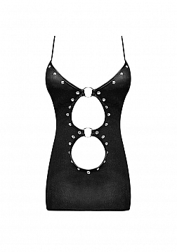 This unique style features a distinctive leather look fabric with four way stretch, nickel plated studs, sexy keyhole openings on sides and front with rings & zip up back. Matching G-String also included. (Accessories not included) soft and stretchy spandex blend offers the ultimate in comfort. Wet look is achieved thru a heat fusion process.
