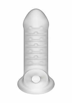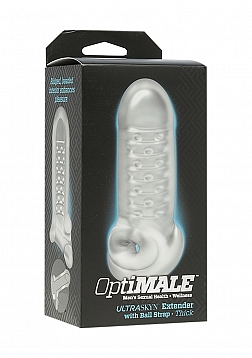 Sometimes you just want a little more. Slide into the OptiMALE™ Thick Extender with Ball Strap for increased length and thickness. Soft and stretchy to perfectly hug your shaft, this majorly size-boosting sleeve stretches six inches from its ball-teasing base to a firm head in a sheer, frosted material that looks and feels incredible. The extender's ribbed, studded interior stimulates the penis, while the attached ball strap holds it in place and tugs at the balls for added pleasure with every thrust.