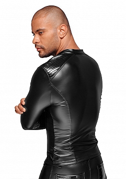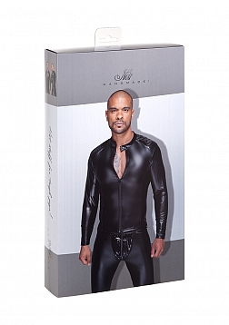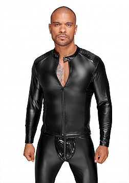 This sexy powerwetlook men's jacket rocks with epaulets made of pleated PVC. Black full-way zipper in the front and collar fastened with a clasp are variations on motorbike jacket.