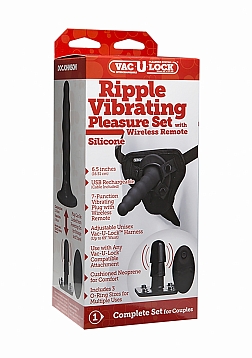 Good vibes only. The Ripple Vibrating Pleasure Set includes everything you need to have a stimulating, satisfying strap-on experience. A USB-rechargeable vibrating Vac-U Plug featuring a 7-function built-in vibrator and wireless remote tucks perfectly into the harness to turn any attachment into a powerful vibrator. The silicone attachment features a textured "ripple" design with multiple stimulating surfaces, and the unisex harness is adjustable and padded for comfort. Everything in this set can be used together or with any other Vac-U-LockĀ compatible product. Vac-U-Lock is the world's first and only patented pleasure system, revolutionizing harness play and offering endless possibilities to mix and match within your collection to build the perfect toy.