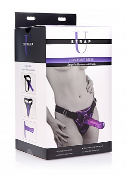 This all-in-one strap on set includes a sexy harness and an ample dildo. The harness features a T-back design that shows off your assets, and double D-ring buckles to adjust the straps at three different points to the perfect size for comfort and security. A sturdy base plate on the dildo ensures maximum control, allowing it to feel like an extension of your body. The dong itself is smooth and sleek, with a curved, bulbous head and subtle swells along the shaft. At seven inches in length, and nearly an inch and a three-quarters in girth, this dildo is not necessarily ideal for penetration beginners, but the simple design does favor those who are new to pegging or female-female strap-on play. This material is compatible with silicone and water-based lubricants and can be cleaned after use with mild soap or toy cleaner.
