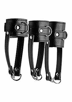 This 4 piece set includes 3 adjustable scrotum harnesses, made of an easy to clean and durable PU leather material. The leash has a simple snap hook closure with wrist loop and plenty of length to control or lead your subject. You can even attach weights, ropes, or other accessories as you desire. The metal is nickel-free to prevent irritation and the material wipes clean easily.