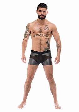 Iron Clad short features a mesh pouch that extends through hips and rear. Low cut waist and high cut legs. Color coordinating, fabric coated, essential waistband. Ultra thin, and flexible, high tech fabric with rubber-like qualities. Cool, breathable mesh inserts. Subtle textured pattern with smooth finish.