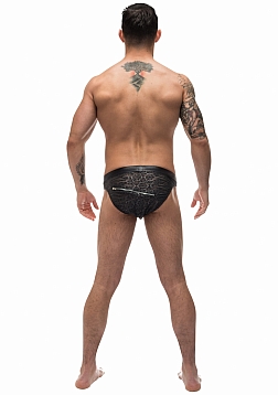 Zip Bikini features diagonal zippers on pouch and rear with protective flaps, contoured pouch, slimming wet look waistband. Semi Sheer burnout fabric with a tone on tone abstract pattern. Lightweight and breathable with all way stretch.