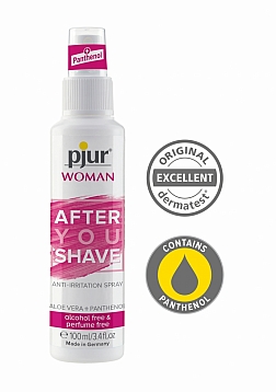 The aftershave product for women! Do you suffer from bumps and itchy skin after shaving your intimate area? It doesn't have to be this way: The panthenol in this product is anti-inflammatory, regenerates and promotes the development of new skin cells. All of which regenerates stressed skin. It does not contain any perfume or alcohol, which is why you won't feel any burning sensation on the skin – just a gentle nurturing effect. pjur WOMAN After YOU Shave is odourless, neutral in taste and, of course, dermatologically tested. Simply shave, apply, and feel great!
