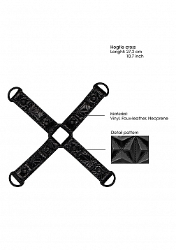 “Getting on all fours” will have an exciting new meaning in your sex life! The OUCH! hogtie fulfills all your kinky dreams, and more! In any BDSM collection, a hogtie plays an important role and with this high-quality equipment you can have a go at it yourself. With their fashionable diamond pattern, these neoprene and faux-leather cuffs and cross really stand out from the crowd! The hogtie consists of 2 ankle cuffs, 2 handcuffs, and a “cross” with four O-rings. The ankle cuffs are 39 cm (15.4”) long and 5.5 cm (2.2”) wide with 7 holes for size adjustment. The handcuffs are 36 cm (14.2”) long and 5 cm (1.97”) with 6 holes for size adjustment. The hogtie “cross” has 4 lengths of 27.2 cm (10.7”) each.