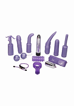 This Toy-Kit includes 12 pieces of pleasure tools: - Jelly coated duo balls - Jelly coated cockring - Adjustable cockring Multi-speed vibrating bullet - 7 different sleeves - Sleek multi speed vibrator