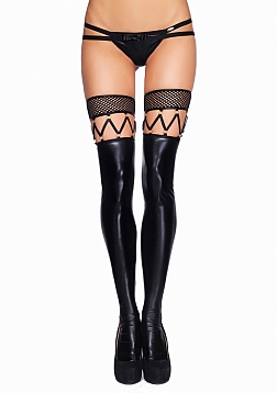 Absolutely stunning and original wetlook stockings with fishnet band at the top, straps and golden O-rings.