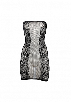 Strapless mini dress with contract lace-pattern and fishnet. Can be worn multiple ways. This dress has a lot of stretch and can be worn from size S to XL.