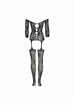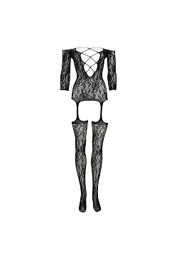 Suspender bodystocking with lace-pattern and deep-V neckline with crossed straps detail. Can be worn on or off-shoulder. This bodystocking has some stretch and can be worn from size S to L.
