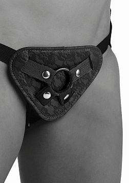 Embrace your femininity to the fullest as you assume the top position. This lovely corset harness features comfortable neoprene panels adorned in an obsidian lace pattern, with black straps that wrap around and accentuate your best assets! The corset-style back ties up to the perfect tightness for sturdy security and sensual seduction. The universal O-ring system has snaps that allow you to replace the standard-sized metal O-ring with a smaller or larger O-ring of your own, and easily feed your dildo through. The straps feature 4 adjustment points so that you are fully supported during even the most passionate moments. This harness is perfect for pegging or female-female penetration.