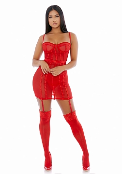 "Sheer Desires" two-piece chemise lingerie set features sheer mesh, elastic trim detail, sweetheart neckline, elastic detail along body and cups, attached garter straps and matching panty. This product comes in a box.