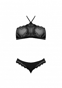 From the Exposed by Magic Silk collection, this style includes: A bandeau featuring halter ties that wrap around the neck and hook & eye closure in the back, and a matching panty featuring scalloped lace accents and a classic back.