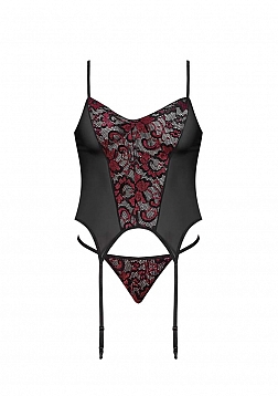 From the Exposed by Magic Silk collection, this style includes: A merry widow featuring adjustable shoulder straps with metal sliders and attached garter straps with metal clips, and a matching lace G-string.
