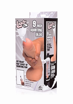 This 9 incher will fill you to the brim. Get ready for Loadz of squirting fun! This ultra lifelike dildo features a dual - density material that looks and feels just like the real thing. Enjoy every vein, wrinkle, and ridge of this ejaculating dong as you enjoy penetration on your own or with a partner. To use, just fill the syringe with Cum Load Unscented Water - based Lube or another fluid, insert the tip of the syringe into the hose, and when you are ready for a wet rush, push in the plunger! This material is compatible with both silicone and water - based lubes and can be cleaned with mild soap and warm water after use.