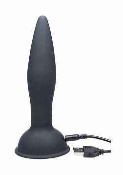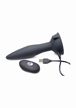 Stuff your bum with vibration and rotation. This remote-controlled anal plug features an extremely powerful buzzing motor and rotating beads at the stem that actually make the entire plug swirl inside you. Explore 3 speeds, 2 patterns, and a turbo mode of synchronized thrumming and twisting. The strong suction-cup base allows you to mount the plug to a hard surface and take a ride. The tapered, seamless design makes it comfortable to insert. Made of premium silicone, this rechargeable butt plug is non-porous and phthalate-free. Avoid use with silicone lubricants and sanitize after use with a mild soap or toy cleaner.
