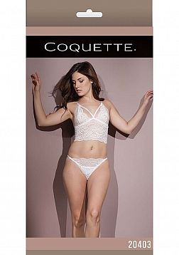Longline bralette with sexy crotchless panty. The scallop lace fabric is stretchy. The cups on the bralette have strappy details and the panty has adjustable straps on the size, this makes it possible to adjust the size.