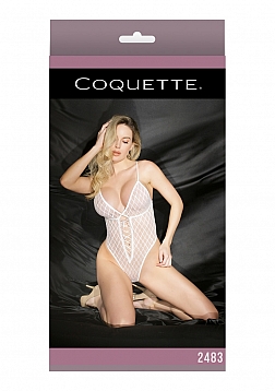 High cut teddy with diamond mesh and lace-up detail at the front. The straps are adjustable.