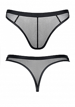 Men's thong made of mesh fabric with decorative waist band, trims and stitching.