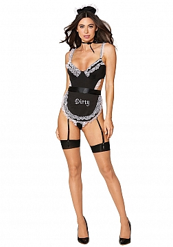 French Maid roleplay teddy with underwired cups, apron and matching headband. The teddy is made of stretch knit and has a ruffled lace trim. The attached garter straps are adjustable. Stockings not included.