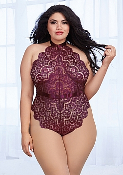 Queen Size Eyelash lace teddy with high, halter neckline that ties at the back. The teddy has an open back design with waist band ribbon that ties in the back, and beautifully shaped bottoms accentuates the curves. Easy to wear to to the crotch with snap closure.
