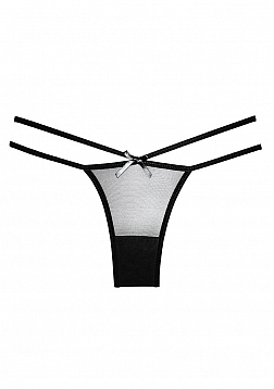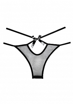 Deliciously cheeky sheer panty with dainty hip hugging bands that reveal petite cut out in back.